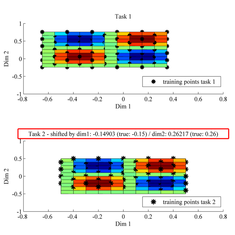The above example can easily be extended from univariate time-series to multivariate quantities (e.g., over spatial coordinates). This case illustrates an example how MTGP could be used for template matching with a bivariate data space. We emphasise that, for this example, tasks S1 and S2 do not have any training data in common. The figures show two 2-dimensional tasks. Task S2 is shifted with respect to task S1 in the x-dimension by -0.15 and in the y-dimension by -0.26. The training points for each task are marked as black asterisks. A MTGP model that has two additional hyperparameters (one for each dimension) is used. As shown in the lower sub-plot (within the red box), the estimates for the x- and y-shift between task S1 and S2 are very close to the actual offsets.